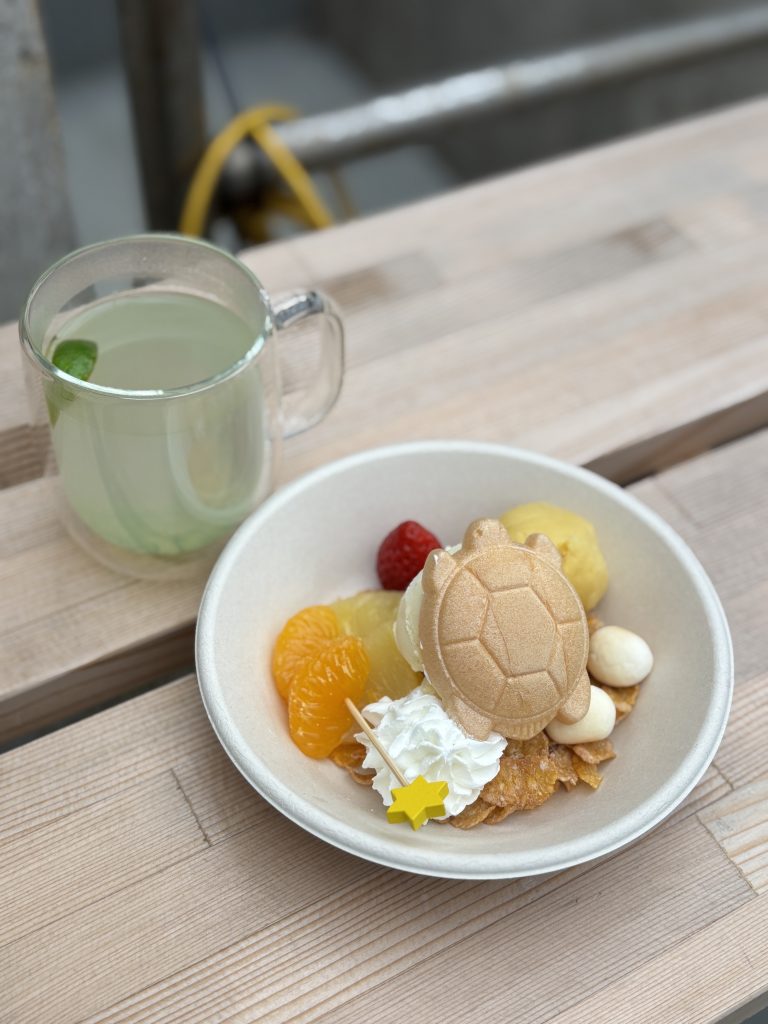 最後は、館内にあるカフェのスイーツ&ドリンクでおやつの時間。可愛いカメさんが乗ってましたよ。😊