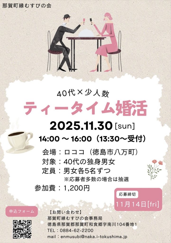 ※こちらのイベントはマリッサとくしまのイベントとは異なり那賀町独自のイベントとなりますので、お問い合わせに関しては下記記載の那賀町縁むすびの会事務局へ直接お問い合わせをお願いいたします。