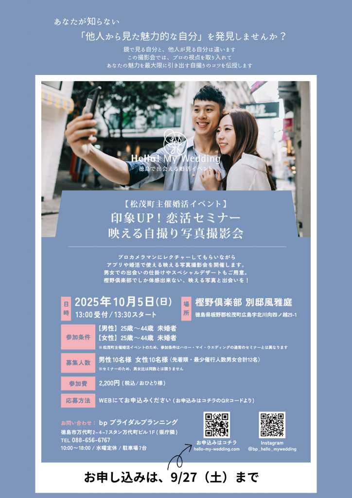 #恋活 #婚活 #イベント #自撮り #映え写真 #松茂町 #徳島県 #ときわ #樫野倶楽部 #婚活支援 #松茂町婚活支援 #ハロー・マイ・ウェディング #bpブライダルプランニング #出会い